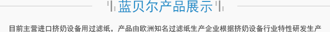 濟南藍貝爾工貿(mào)有限公司主要產(chǎn)品擠奶設備過濾紙,牛奶過濾紙,擠奶機過濾袋,目前主營進口擠奶設備用過濾紙,產(chǎn)品由歐洲知名過濾紙生產(chǎn)企業(yè)根據(jù)擠奶設備行業(yè)特性研發(fā)生產(chǎn),產(chǎn)品符合歐盟食品接觸標準及FDA食品接觸標準,產(chǎn)品在擠奶設備過濾紙行業(yè)占有70%以上的份額。并通過了SGS標準技術檢測中心按國標食品級標準進行的檢測。產(chǎn)品適用于各種擠奶設備品牌,本公司目前獲得該區(qū)域產(chǎn)品營銷資格。產(chǎn)品已用于國內(nèi)各大乳企所屬牧...